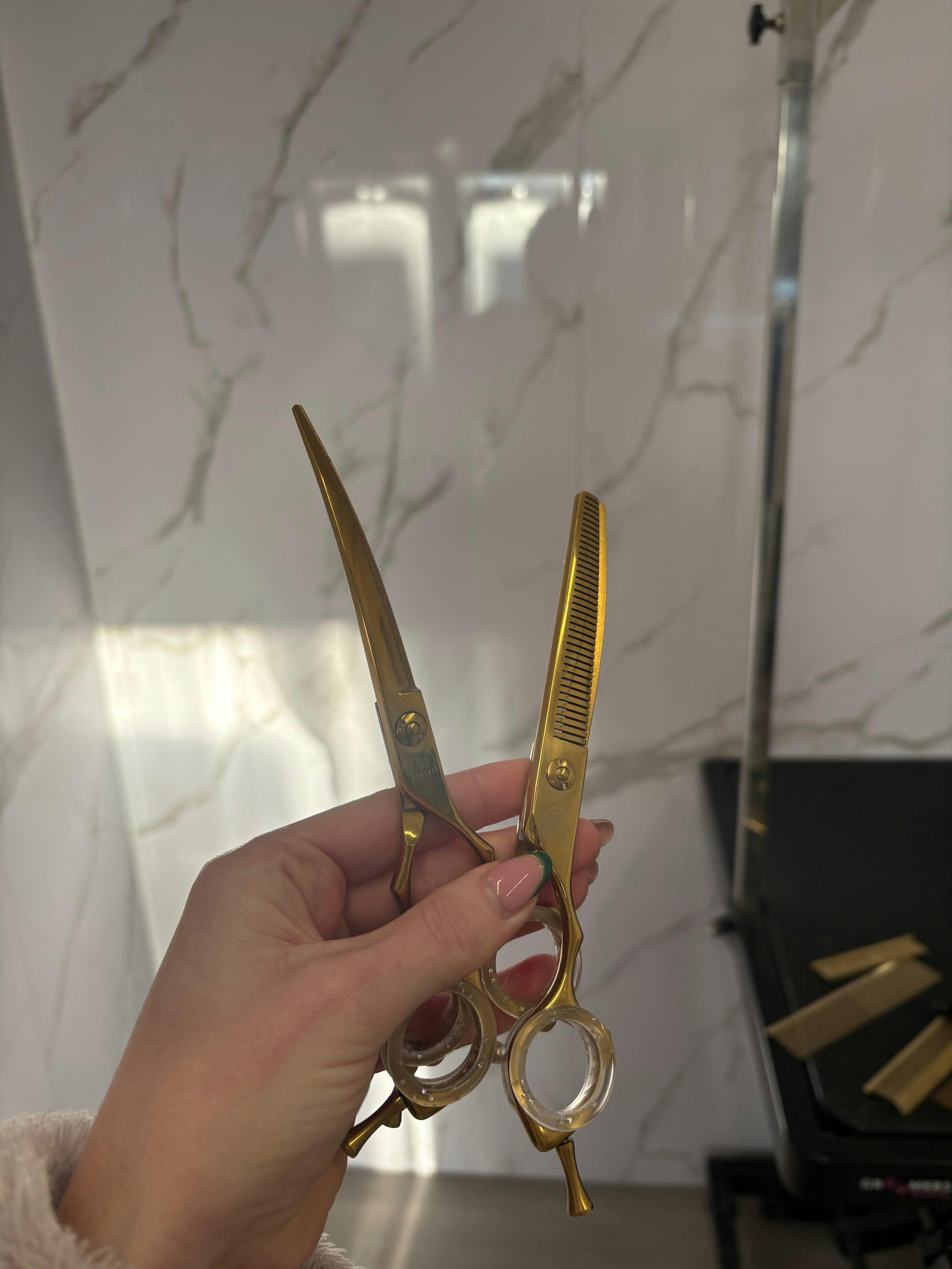 • ⁠6.25” VG10 Gold Detailing Curved Scissors: Sleek, sharp, and oh-so-lightweight, with ergonomic butterfly handles for ultimate control and comfort.
