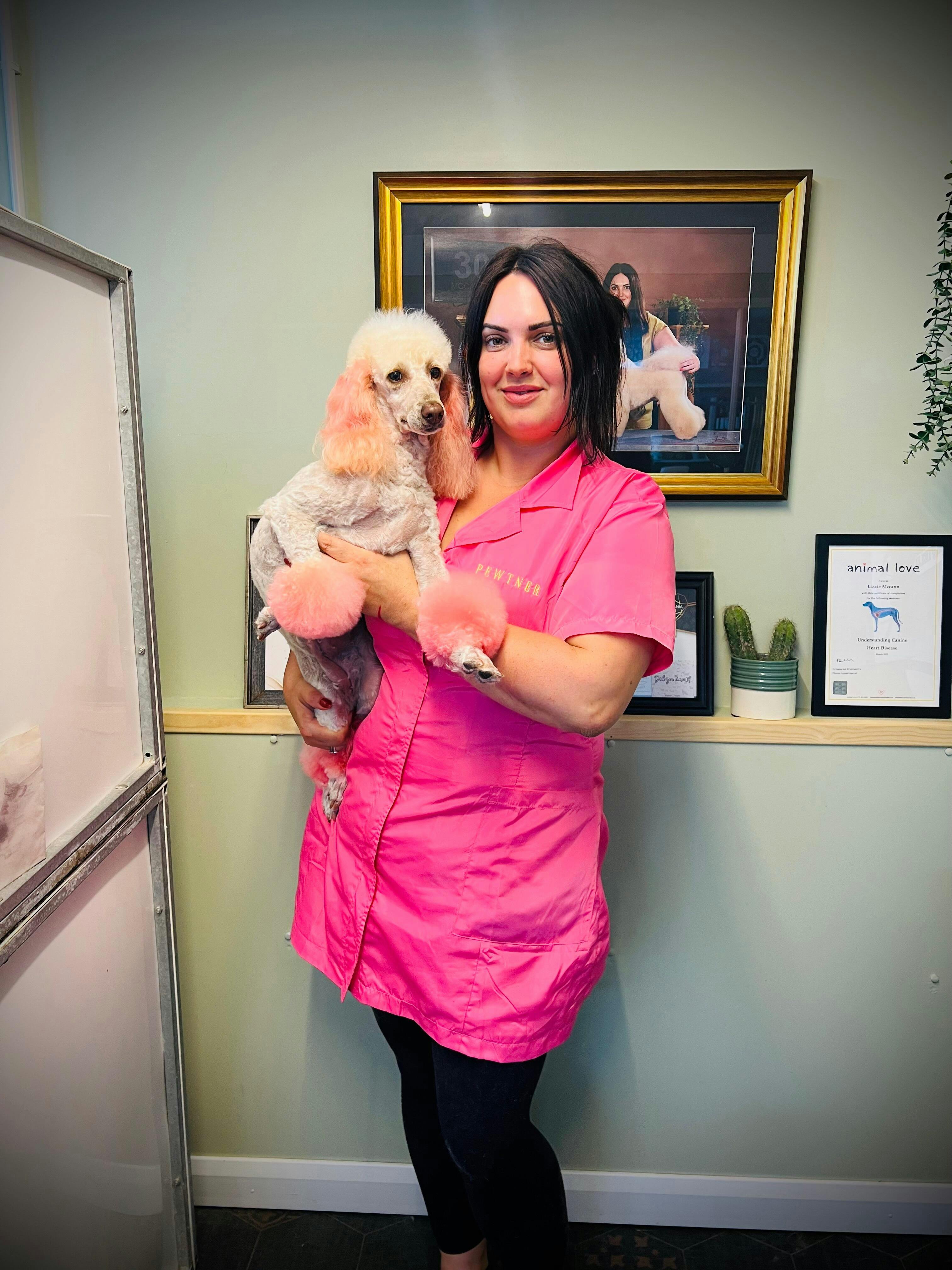 Whether you’re snipping, scrubbing, or just strutting between dogs, Pewty Tooty keeps you looking fierce, feeling fresh, and totally in control. She’s cute. She’s cool. She’s completely crush-proof (even when the dogs aren’t).